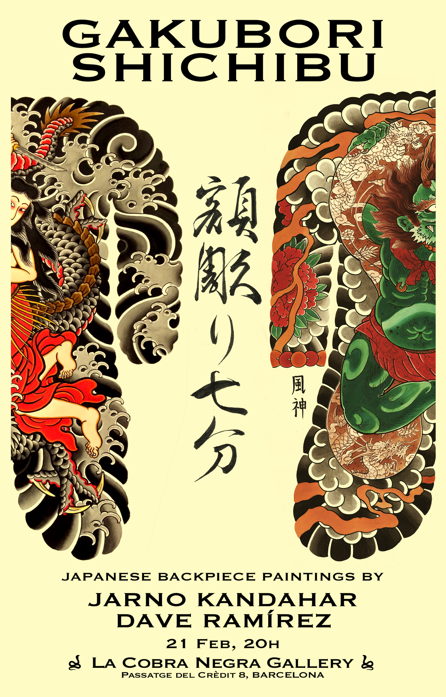 New exhibition at La Cobra Negra Gallery at Aloha Tattoos starts next Saturday, the 21st of February at 20:00 in Barcelona. Japanese backpiece paintings by Jarno Kandhar and Dave Ramírez. You can buy prints and originals from there, or online via jarno@tatuata.com.